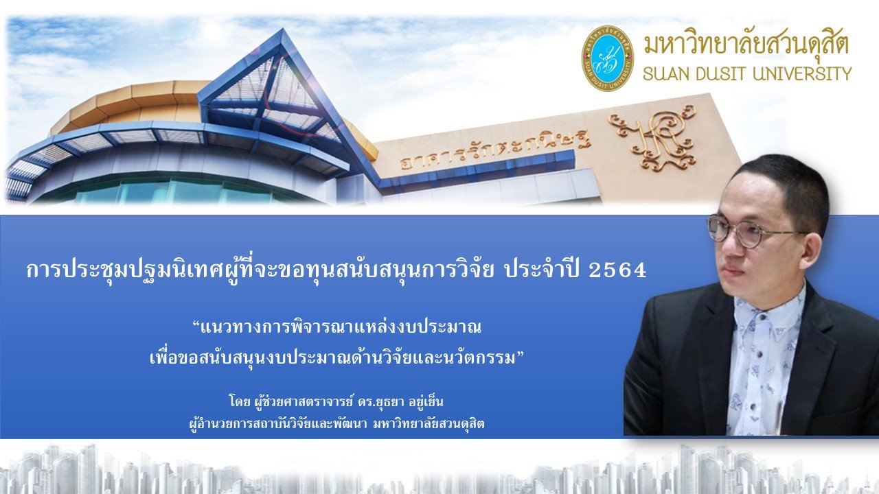 สถาบันวิจัยและพัฒนา ดำเนินจัดกิจกรรมปฐมนิเทศผู้ที่จะขอทุนสนับสนุนการวิจัย ประจำปี 2564 เรื่อง แนวทางการสนับสนุนทุนวิจัยและการพิจารณาแหล่งทุนสนับสนุนงบประมาณด้านการวิจัยและนวัตกรรม ในวันที่ 20 กรกฎาคม 2564 เวลา 10.00-12.00น. ประชุมออนไลน์ผ่านโปรแกรม Microsoft Team