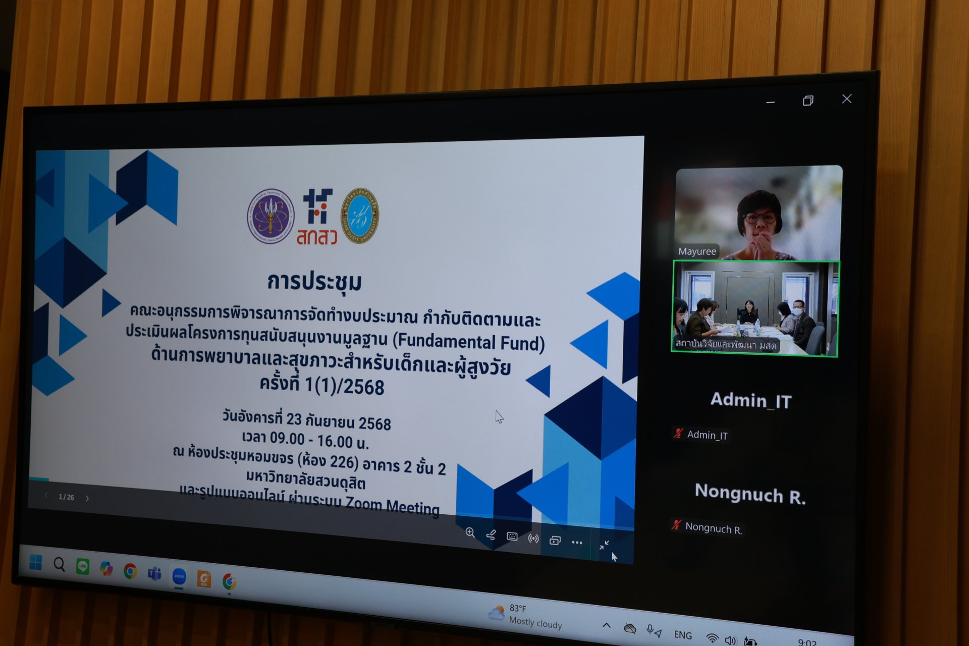 สถาบันวิจัยและพัฒนา มหาวิทยาลัยสวนดุสิต จัดประชุมคณะอนุกรรมการพิจารณาการจัดทำงบประมาณ กำกับติดตาม และประเมินผลโครงการทุนสนับสนุนงานมูลฐาน (Fundamental Fund) ประจำปีงบประมาณ พ.ศ. 2570 แผนงานด้านการพยาบาลและสุขภาวะสำหรับเด็กและผู้สูงวัย ครั้งที่ 1(1)/2568 โดยมี ผศ.ดร.พรพัสนันท์ เดชประสิทธิโชค รองผู้อำนวยการสถาบันวิจัยและพัฒนา เป็นประธานการประชุม เพื่อพิจารณาโครงการแผนงานด้านการพยาบาลและสุขภาวะสำหรับเด็กและผู้สูงวัย มหาวิทยาลัยสวนดุสิต จำนวน 11 โครงการ รวมทั้งกำหนดแนวทางการจัดทำงบประมาณและการติดตามประเมินผลให้สอดคล้องกับเป้าหมายของกองทุนสนับสนุนงานมูลฐานอย่างมีประสิทธิภาพ การประชุมจัดขึ้นในวันที่ 23 กันยายน พ.ศ. 2568 ณ ห้องประชุมหอมขจร อาคาร 2 ชั้น 2 มหาวิทยาลัยสวนดุสิต และผ่านระบบออนไลน์