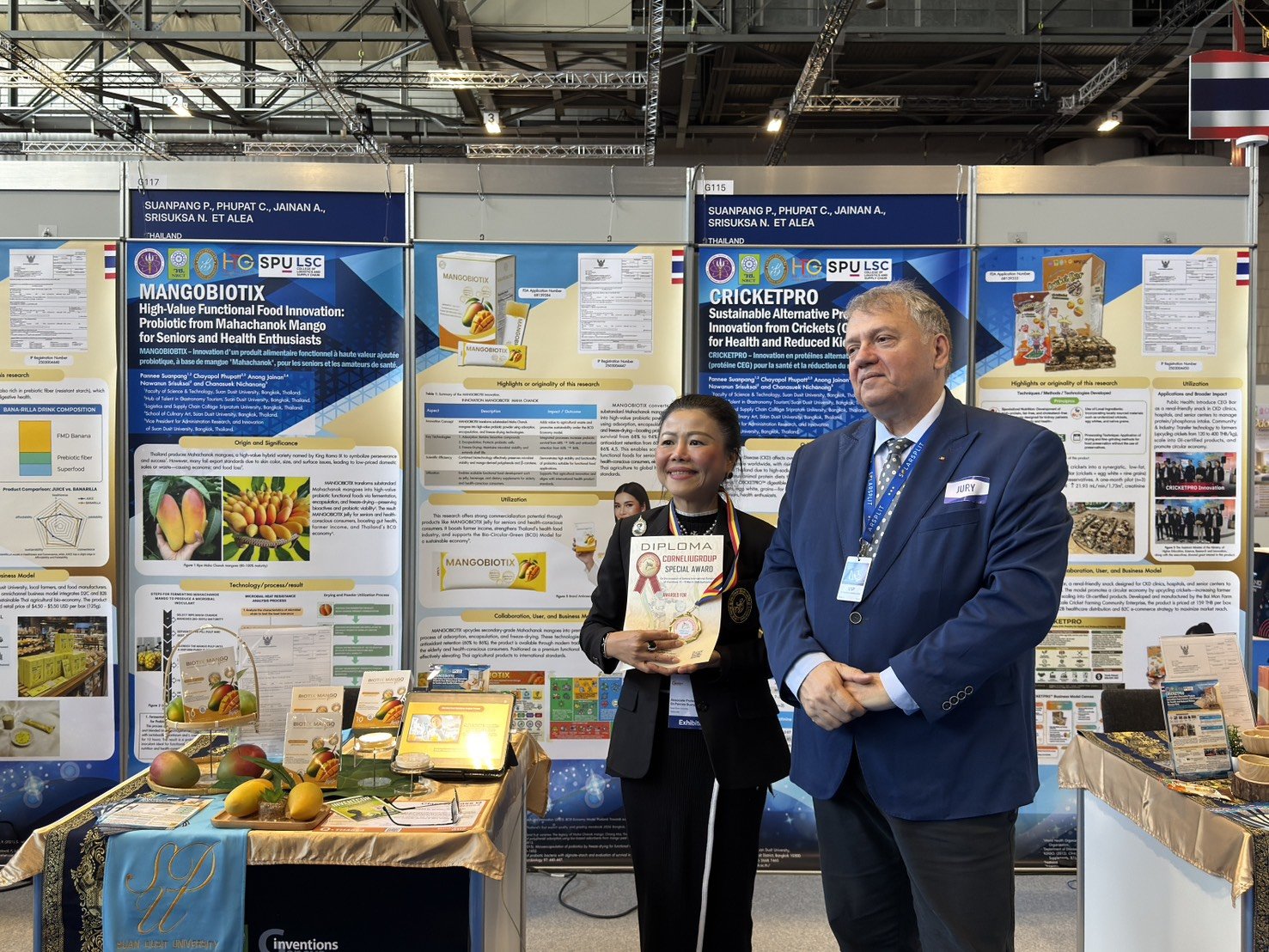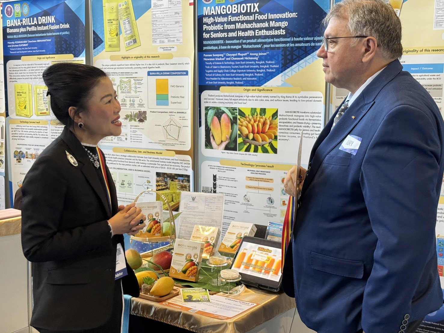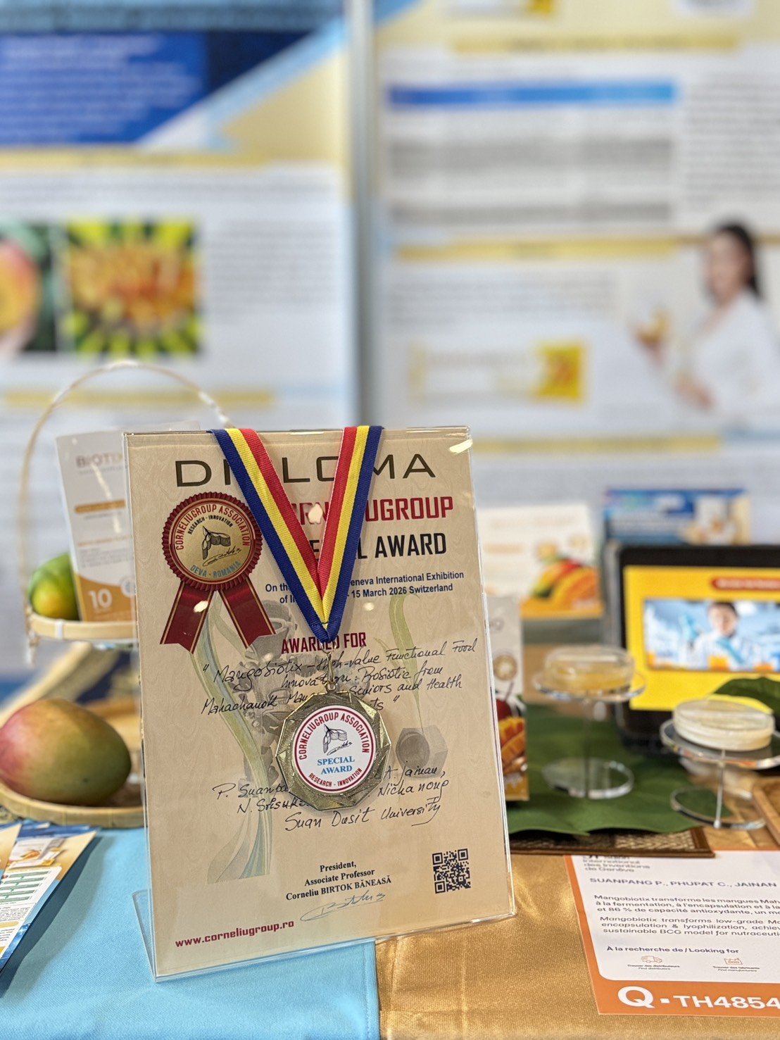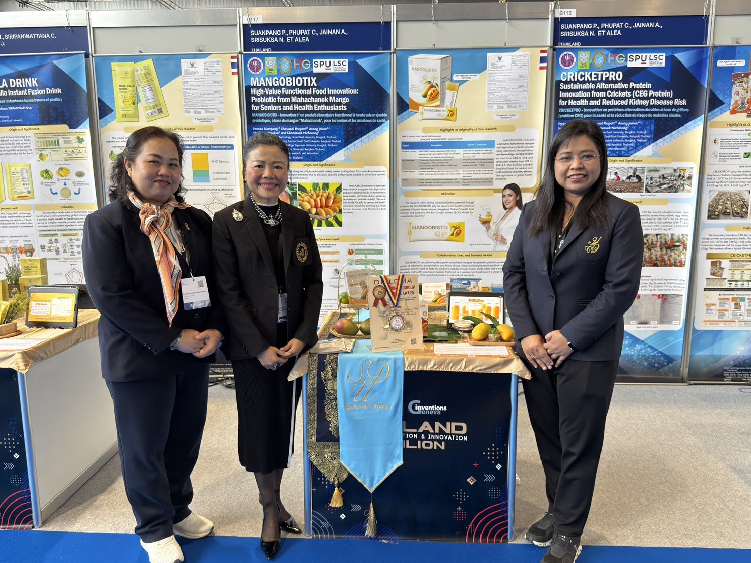 รศ.ดร.ชนะศึก นิชานนท์ รองอธิการบดีฝ่ายบริหาร วิจัยและนวัตกรรม พร้อมด้วยผศ.ดร.จิตต์วิมล คล้ายสุบรรณ ผู้อำนวยการสถาบันวิจัยและพัฒนา นำทีมนักวิจัยมหาวิทยาลัยสวนดุสิต นำผลงานนวัตกรรมด้านอาหารเข้าประกวดในงาน “The 51st International Exhibition of Inventions Geneva” ประจำปี 2569 ณ นครเจนีวา สมาพันธรัฐสวิส ซึ่งเป็นผลงานที่เกิดจากความร่วมมือของคณะวิทยาศาสตร์และเทคโนโลยี โรงเรียนการเรือน และสถาบันวิจัยและพัฒนา ทั้งนี้นักวิจัยของมหาวิทยาลัยสวนดุสิตสร้างชื่อเสียงให้แก่ประเทศไทยด้วยการคว้ารางวัล Special Award ซึ่งเป็นรางวัลยกย่องเชิดชูเกียรติจากประเทศโรมาเนีย ในผลงาน “MANGOBIOTIX- นวัตกรรมผลิตภัณฑ์อาหารฟังก์ชันนัลมูลค่าสูงโปรไบโอติกจากมะม่วงมหาชนกสำหรับผู้สูงอายุและคนรักสุขภาพ” โดย รศ.ดร.พรรณี สวนเพลง และคณะ ความสำเร็จในครั้งนี้สะท้อนศักยภาพการเป็นผู้นำด้านนวัตกรรมอาหารเพื่อสุขภาพที่ได้รับการยอมรับในเวทีระดับนานาชาติ