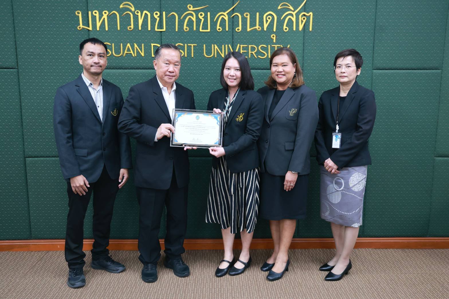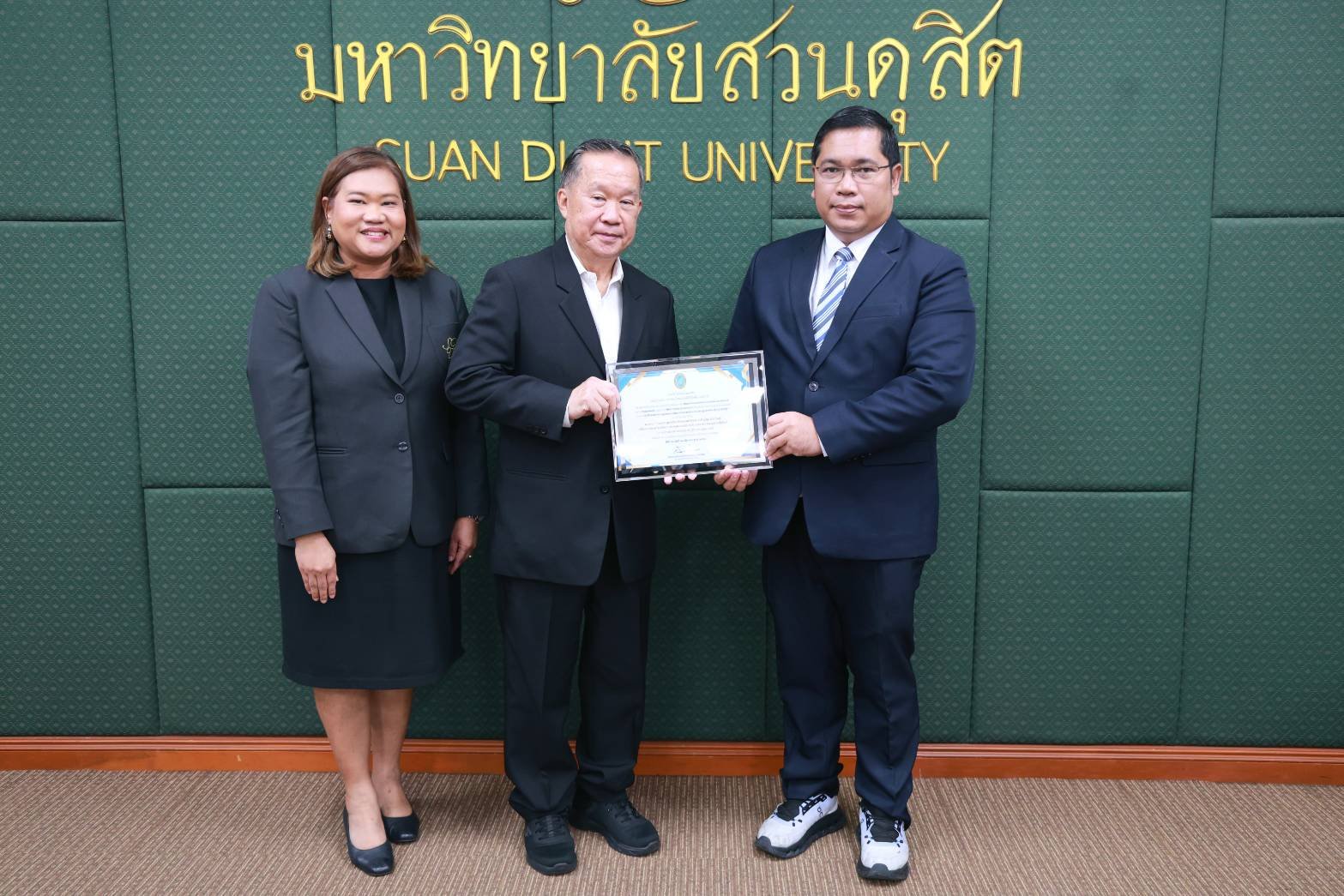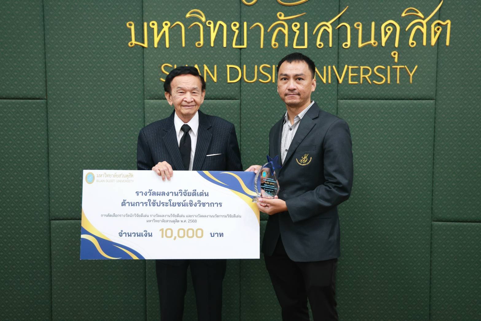 สถาบันวิจัยและพัฒนา มหาวิทยาลัยสวนดุสิต จัดพิธีมอบรางวัลนักวิจัยดีเด่น รางวัลผลงานวิจัยดีเด่น และรางวัลผู้สร้างชื่อเสียงในระดับนานาชาติ ปี พ.ศ. 2568 ในการประชุมสภามหาวิทยาลัย ครั้งที่ 3(31)/2569 โดยได้รับเกียรติจาก ดร.ถนอม อินทรกำเนิด นายกสภามหาวิทยาลัย มอบรางวัลนักวิจัยดีเด่น สาขาวิทยาศาสตร์และเทคโนโลยี ได้แก่ ผู้ช่วยศาสตราจารย์ ดร.ปัญญภัสก์ ปิ่นแก้ว สังกัดโรงเรียนการเรือน รางวัลนักวิจัยดีเด่น สาขามนุษยศาสตร์และสังคมศาสตร์ จำนวน 2 ราย ได้แก่ รองศาสตราจารย์ ดร.วรวิทย์ กิจเจริญไพบูลย์ สังกัดคณะมนุษยศาสตร์และสังคมศาสตร์ และดร.ขวัญนภา สุขคร สังกัดศูนย์การศึกษาลำปาง และมอบรางวัลผลงานวิจัยดีเด่น ด้านการใช้ประโยชน์เชิงวิชาการ ได้แก่ ดร.วีรชน ภูหินกอง สังกัดคณะวิทยาศาสตร์และเทคโนโลยี พร้อมทั้งได้รับเกียรติจาก คุณธงชัย ศรีดามา อุปนายกสภามหาวิทยาลัย มอบรางวัลผู้สร้างชื่อเสียงในระดับนานาชาติ โดยนำผลงานวิจัยและนวัตกรรมเข้าร่วมประกวด และจัดแสดงในเวทีนานาชาติ จำนวน 3 เวทีสำคัญ ได้แก่ 1.งาน “The 50th International Exhibition of Inventions Geneva” ณ นครเจนีวา สมาพันธรัฐสวิส 2.งาน “The 8th China (Shanghai) International Invention & Innovation Expo 2025”ณ เมืองเซี่ยงไฮ้ สาธารณรัฐประชาชนจีน และ 3.งาน “Kaohsiung International Invention & Design EXPO (KIDE 2025)” ณ เมืองเกาสง ไต้หวัน ซึ่งพิธีมอบรางวัลจัดขึ้น ในวันที่ 27 มีนาคม พ.ศ. 2569 ณ ห้องประชุมลำพอง 2 มหาวิทยาลัยสวนดุสิต
