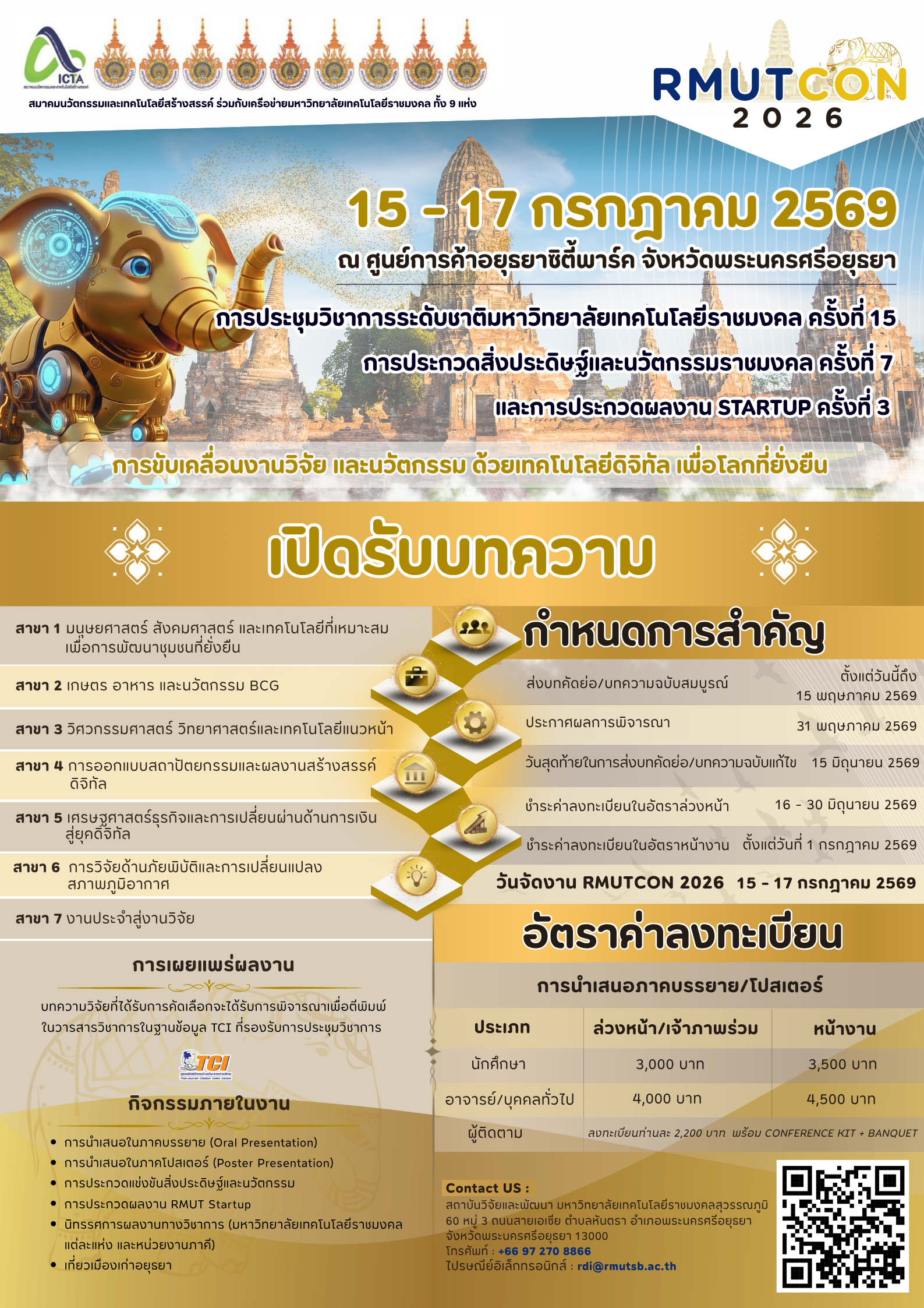 ผู้สนใจ สามารถลงทะเบียนส่งบทคัดย่อ/บทความฉบับสมบูรณ์ ผ่านระบบออนไลน์ และสามารถส่งได้ตั้งแต่บัดนี้ถึงวันศุกร์ที่ 15 พฤษภาคม 2569 ติดต่อสอบถามเพิ่มเติมได้ที่ สถาบันวิจัยและพัฒนา โทรศัพท์ 09 7270 8866 ไปรษณีย์อิเล็กทรอนิกส์ rdi@rmutsb.ac.th รายละเอียดตามเอกสารที่แนบมาพร้อมนี้